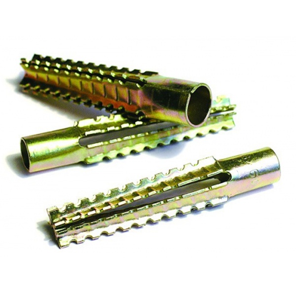 Стальной оцинкованный (желтый цинк) распорный дюбель для разных оснований. В ячеистом бетоне монтируется без сверления отверстия.