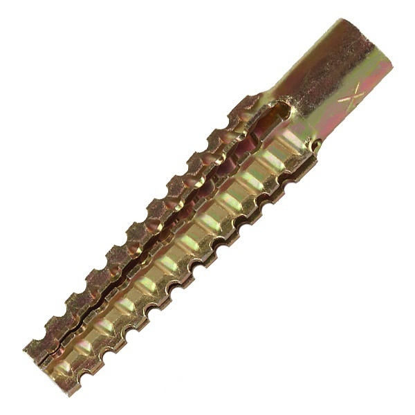 Стальной оцинкованный (желтый цинк) распорный дюбель для разных оснований. В ячеистом бетоне монтируется без сверления отверстия.