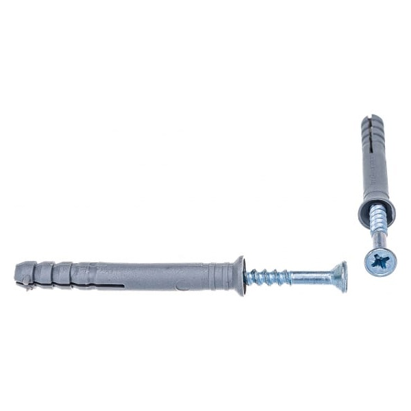Полипропиленовый распорный дюбель для быстрого монтажа со стальным оцинкованным гвоздем-шурупом с увеличенным подголовником.