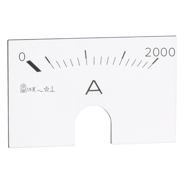Аналоговый прибор оснащен шкалой для отображения соответствующих показаний измерений. Данная модель известной торговой марки Legrand подходит для амперметра 004600 и представляет собой плоскую градуированную шкалу с измерением в амперах. Максимальное значение измерений на циферблате составляет 2000 Ампер. Он имеет нулевое положение и одностороннее направление с предельным углом отклонения стрелки прибора 90°. Ось указателя расположена по центру амперметра.