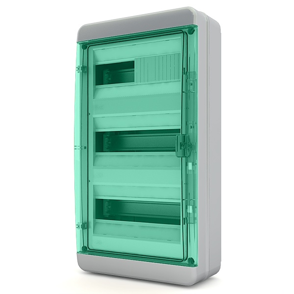 Влагозащищенный электрический шкаф Текфор, накладного монтажа, трехрядный на 36 модулей, с прозрачной зеленой дверцей 01-03-042