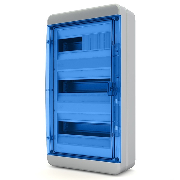 Влагозащищенный электрический шкаф Текфор, накладного монтажа, трехрядный на 36 модулей, с прозрачной синей дверцей 01-03-044
