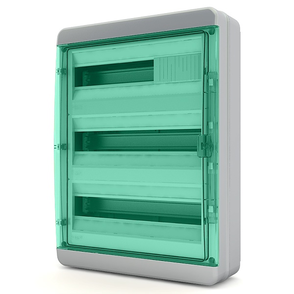 Влагозащищенный электрический шкаф Текфор, накладного монтажа, трехрядный на 54 модуля, с прозрачной зеленой дверцей 01-03-062