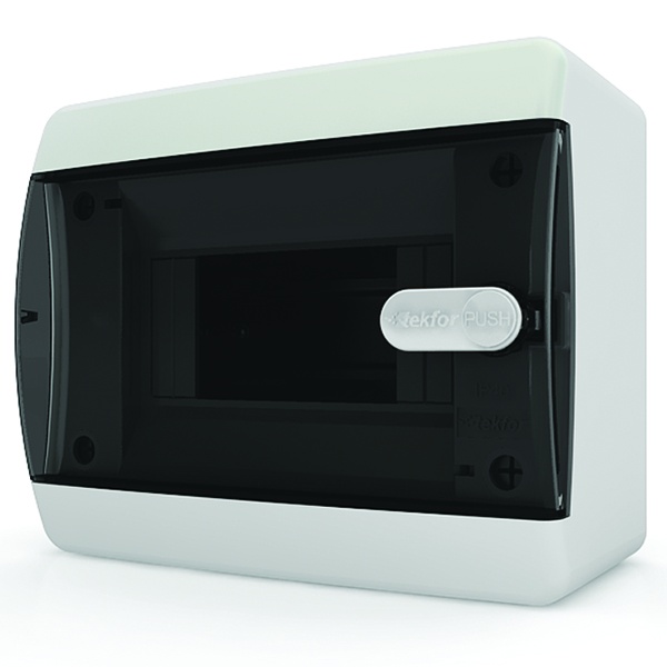 Распределительный электрощит Текфор, накладного монтажа, на 6 модулей, с прозрачной черной дверцей, укомплектован DIN-рейкой, нулевой и земляной шиной 01-04-001