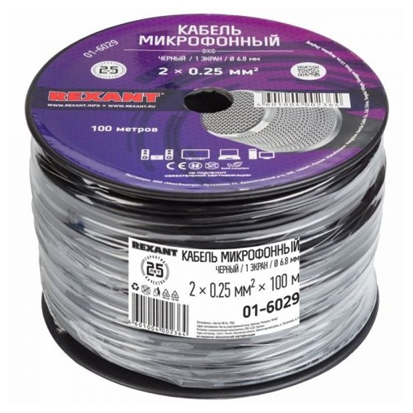 Микрофонный кабель 2x0,25 мм? REXANT предназначен для подключения микрофонной аппаратуры.Проводник кабеля выполнен из двух многопроволочных медных жил, сечением 0,25 мм? каждая.Экран состоит из медного чулка.Предусмотрена обмотка из 48 шелковых нитей, которая предназначена для обеспечения наибольшей прочности кабеля.Материал внешней оболочки – ПВХ, цвет – черный.Диаметр кабеля составляет 6,8 мм.