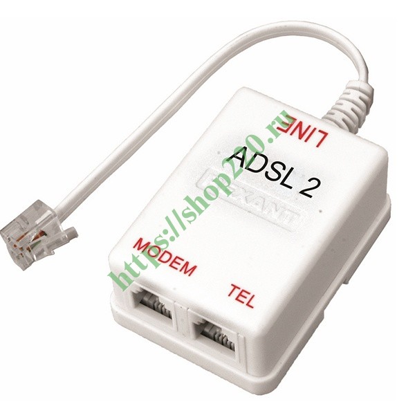 ADSL 2 сплиттер предназначен для разделения стандартного сигнала телефонной линии на телефон и ADSL-модем. В ADSL сплиттере имеются два входа, один для модема, а второй для телефонного аппарата. С телефонной линией сплиттер соединяется с помощью провода (разъем находится на проводе).