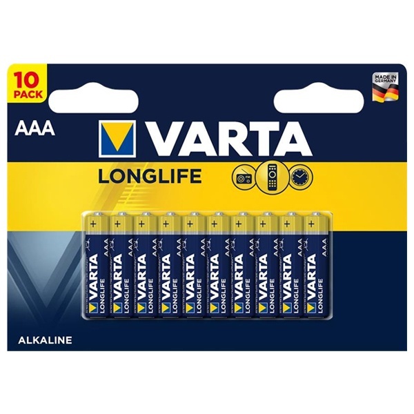 Алкалиновые элементы питания мизинчиковые Varta Longlife, типоразмера ААА/LR03, упаковка 10 штук 4008496609314