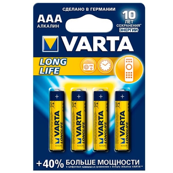 Алкалиновые элементы питания мизинчиковые Varta Longlife, типоразмера ААА/LR03, упаковка 4 штуки 4008496847075