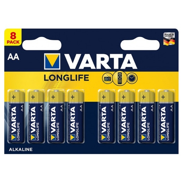 Алкалиновые элементы питания пальчиковые Varta Longlife, типоразмера АА/LR6, упаковка 8 штук 4008496554324