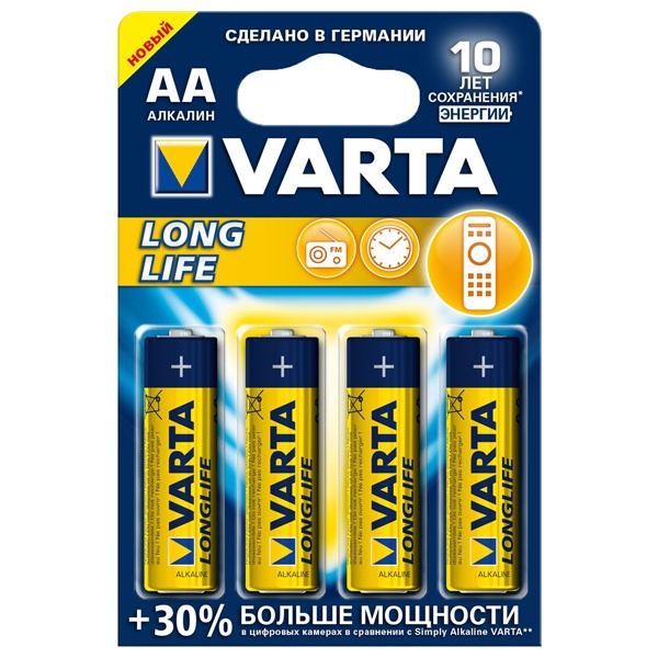 Алкалиновые элементы питания пальчиковые Varta Longlife, типоразмера АА/LR6, упаковка 4 штуки 04106113414