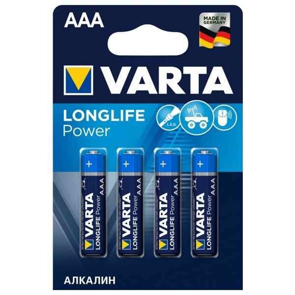 Алкалиновые элементы питания мизинчиковые Varta Longlife Power, типоразмера ААА/LR03, упаковка 4 штуки 04903113414