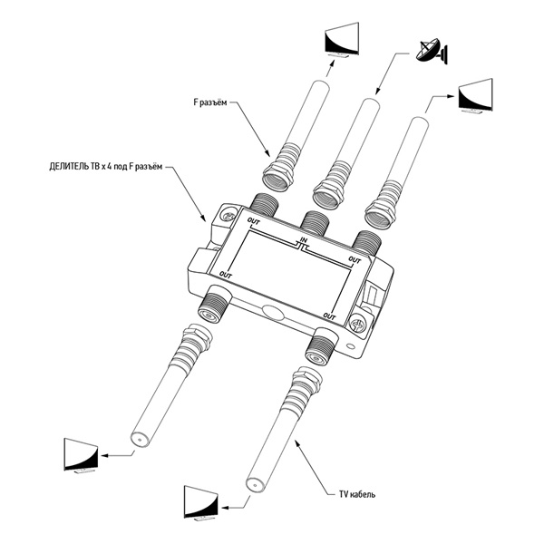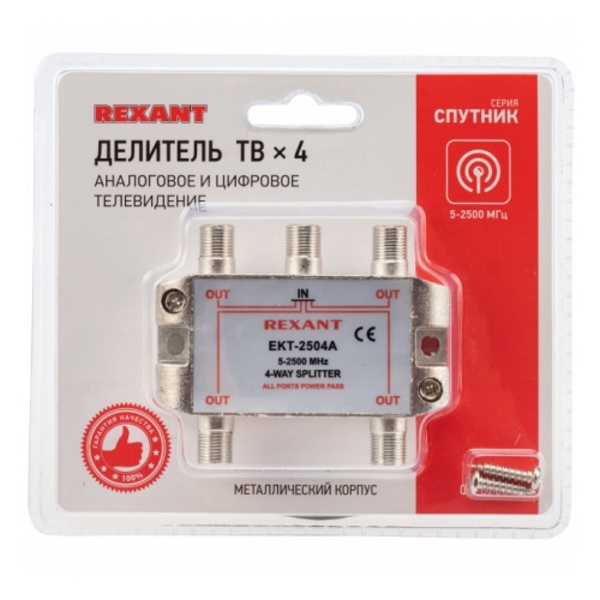 Телевизионный делитель это удобное средство для разделения сигнала на несколько равных частей. Антенные делители, также называемые телевизионные сплиттеры часто используются, когда требуется подключить один телевизионный кабель, идущий от антенны, сразу к нескольким телевизорам или ресиверам. Особенно это актуально в многокомнатных квартирах или многокомнатных загородных домах. Делитель имеет один вход под F разъем и четыре выхода, также под F разъемы. Сигнал, подающийся на вход делителя, делится на две равные части и передается на выходы. Для подключения кабелей используются стандартные F-разъемы. Полоса пропускания делителя от 5 до 2500МГц позволяет использовать его в системах спутникового телевидения. Качественно изготовленный ТВ сплиттер Rexant долго и надежно прослужит в составе телевизионной системы, делая удобной эксплуатацию нескольких телевизоров.