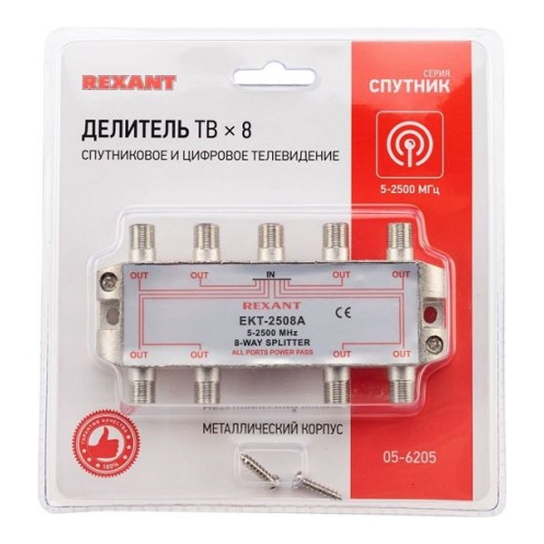 Телевизионный делитель это удобное средство для разделения сигнала на несколько равных частей. Антенные делители, также называемые телевизионные сплиттеры часто используются, когда требуется подключить один телевизионный кабель, идущий от антенны, сразу к нескольким телевизорам или ресиверам. Особенно это актуально в многокомнатных квартирах или многокомнатных загородных домах. Делитель имеет один вход под F разъем и шесть выходов, также под F разъемы. Сигнал, подающийся на вход делителя, делится на две равные части и передается на выходы. Для подключения кабелей используются стандартные F-разъемы. Полоса пропускания делителя от 5 до 2500МГц позволяет использовать его в системах спутникового телевидения. Качественно изготовленный ТВ сплиттер Rexant долго и надежно прослужит в составе телевизионной системы, делая удобной эксплуатацию нескольких телевизоров.