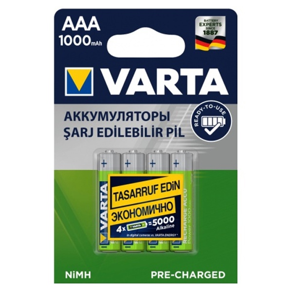 Никель-металлогидридные NiMH (Ni-MH) аккумуляторы Varta типоразмера ААА/HR03, емкостью 1000 мАч, упаковка 4 штуки 05703301414