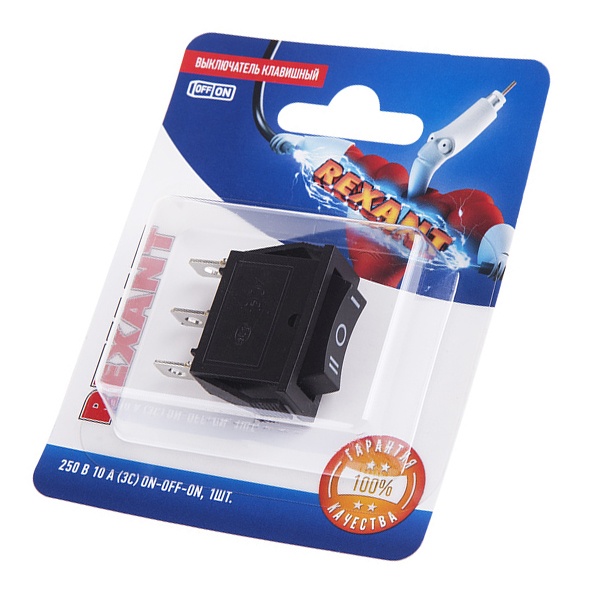 Устройство переключения от компании Rexant представляет собой компактный клавишный выключатель на 3 положения с нейтралью и фиксацией: On/Off/On. С помощью него осуществляется коммутация одной линии в электрической цепи переменного тока с напряжением до 250 Вольт. Выключатель применяется в качестве комплектующего изделия различного электрооборудования в быту и на производстве, например, в сетевых фильтрах, устройствах освещения, блоках питания и т.п. Эта модель сделана из пластика в черном цвете и имеет прямоугольную форму, при этом световая индикация коммутационного положения отсутствует. Номинальная нагрузка тока для устройства составляет 10 Ампер. Его монтаж производится простым защелкиванием без применения винтов на плоских панелях толщиной от 0.8 до 3 мм. Количество контактных групп – 1, количество контактов в контактной группе – 3. Подключение контактов осуществляется плоской клеммой на 6.6 мм, либо с помощью пайки. Механическая износостойкость переключателя составляет 10 000 циклов. Рабочая температура эксплуатации находится в диапазоне от -25 до +85 градусов Цельсия. Изделие упаковано в фирменный блистер.