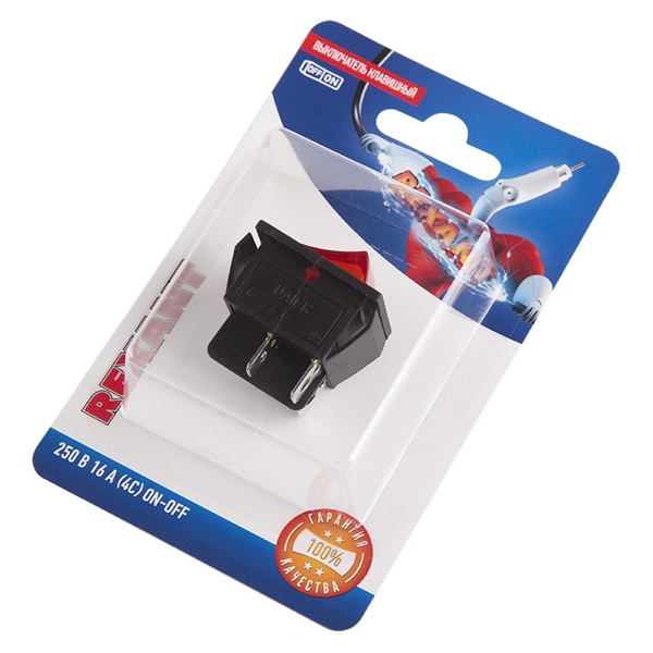 Устройство коммутации от компании Rexant представляет собой компактный клавишный двухполюсный выключатель на 2 положения: On-Off – с помощью которого осуществляется управление нагрузкой в электрической цепи переменного тока напряжением до 250 Вольт. Оно применяется в качестве комплектующего изделия различного электрооборудования, например в сетевых фильтрах и удлинителях, блоках питания и т.п. Эта модель выключателя сделана из пластика и оснащена красной подсветкой для индикации коммутационного положения. Номинальная нагрузка тока для устройства составляет 16 Ампер. Его монтаж производится простым защелкиванием без применения винтов на плоских панелях толщиной от 0.8 до 3 мм. Количество контактных групп – 2, количество контактов в контактной группе – 2. Подключение контактов осуществляется плоской клеммой, либо с помощью пайки. Механическая износостойкость переключателя составляет 10 000 циклов. Рабочая температура эксплуатации находится в диапазоне от -25 до +85 градусов Цельсия. Изделие поставляется в фирменной блистерной упаковке.