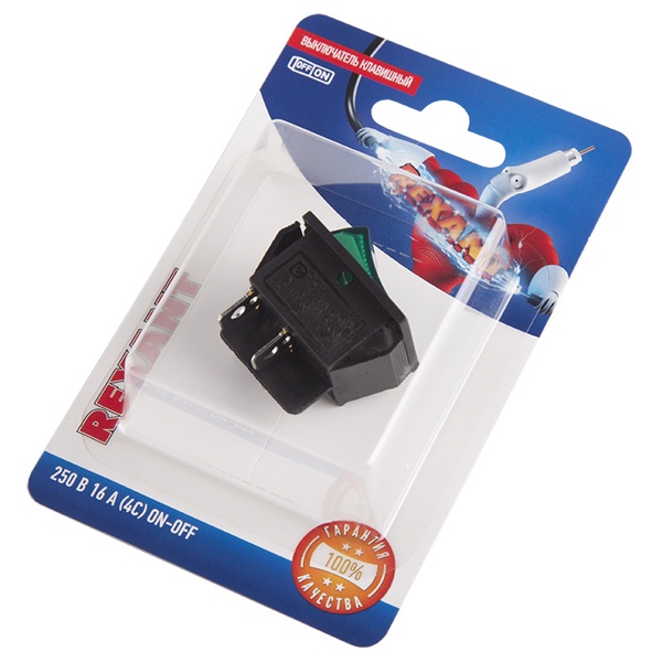 Клавишный выключатель торговой марки Rexant представляет собой двухполюсное устройство на 2 положения: On-Off – которое предназначено для коммутации электрических цепей переменного тока напряжением до 250 Вольт. Оно обладает зеленой световой индикацией коммутационной позиции, чем обеспечивает удобство и наглядность за работой устройства. Клавишный переключатель применяется в качестве комплектующего изделия в сетевых фильтрах, удлинителях, блоках питания и т.п. Принцип его действия основан на замыкании и размыкании контактов в электрической цепи. Нагрузка тока для этого устройства составляет 16 Ампер. Его монтаж осуществляется без применения винтов на плоских панелях толщиной от 0.8 до 3 мм. Количество контактных групп – 2, количество контактов в контактной группе – 2. Подключение контактов осуществляется плоской клеммой, либо с помощью пайки. Механическая износостойкость пластикового переключателя составляет 10 000 циклов. Рабочая температура эксплуатации находится в диапазоне от -25 до +85 градусов Цельсия. Изделие поставляется в фирменной блистерной упаковке.