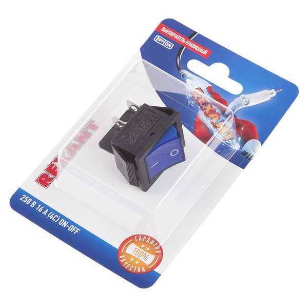 Миниатюрный клавишный двухполюсный выключатель от компании Rexant представляет собой устройство с синей подсветкой, которое предназначено для коммутации электрических цепей переменного тока напряжением до 250 Вольт. Оно применяется в качестве комплектующего изделия различного электрооборудования: в сетевых фильтрах и удлинителях, блоках питания и т.п. Данный клавишный переключатель имеет два положения: On-Off. Номинальный ток, на который рассчитан прибор, составляет 16 Ампер. Его монтаж осуществляется без применения винтов на плоских панелях толщиной от 0.8 до 3 мм. Количество контактных групп – 2, количество контактов в контактной группе – 2. Подключение контактов осуществляется плоской клеммой, либо с помощью пайки. Механическая износостойкость переключателя составляет 10 000 циклов. Рабочая температура эксплуатации находится в диапазоне от -25 до 85 градусов Цельсия. Изделие поставляется в фирменной блистерной упаковке.