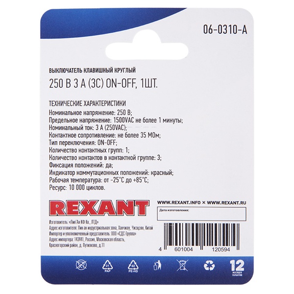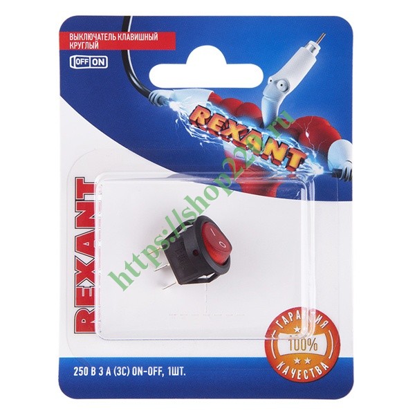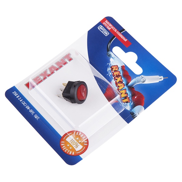 Клавишный однополюсный выключатель торговой марки Rexant представляет собой круглое устройство на 2 положения: On-Off – которое предназначено для коммутации электрических цепей переменного тока напряжением до 250 Вольт. Оно обладает красной световой индикацией коммутационной позиции, чем обеспечивает удобство и наглядность за работой устройства. Клавишный переключатель применяется в качестве комплектующего изделия в сетевых фильтрах, удлинителях, блоках питания и т.п. Нагрузка тока для данной модели составляет 3 Ампера. Монтаж осуществляется простым защелкиванием на плоских панелях толщиной от 0.8 до 3 мм. Количество контактных групп – 1, количество контактов в контактной группе – 3. Подключение контактов осуществляется плоской клеммой, либо с помощью пайки. Механическая износостойкость переключателя составляет 10 000 циклов. Рабочая температура эксплуатации находится в диапазоне от -25 до +85 градусов Цельсия. Изделие из пластика поставляется в фирменной блистерной упаковке.