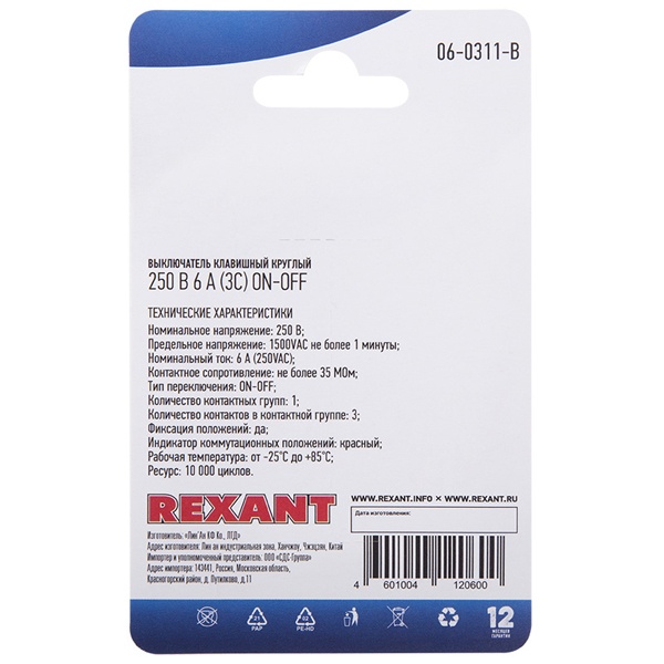 Устройство коммутации от компании Rexant представляет собой компактный клавишный однополюсный выключатель на 2 положения с фиксацией: On-Off – с помощью которого осуществляется коммутация одним элементом управления в электрической цепи переменного тока напряжением до 250 Вольт. Он применяется в качестве комплектующего изделия различного электрооборудования, например в сетевых фильтрах и удлинителях, блоках питания и т.п. Эта модель выключателя сделана из пластика, имеет круглую форму и оснащена красной подсветкой для индикации коммутационного положения. Номинальная нагрузка тока для устройства составляет 6 Ампер. Его монтаж производится простым защелкиванием без применения винтов на плоских панелях толщиной от 0.8 до 3 мм. Количество контактных групп – 1, количество контактов в контактной группе – 3. Подключение контактов осуществляется плоской клеммой, либо с помощью пайки. Механическая износостойкость переключателя составляет 10 000 циклов. Рабочая температура эксплуатации находится в диапазоне от -25 до +85 градусов Цельсия. Изделие поставляется в фирменной блистерной упаковке.