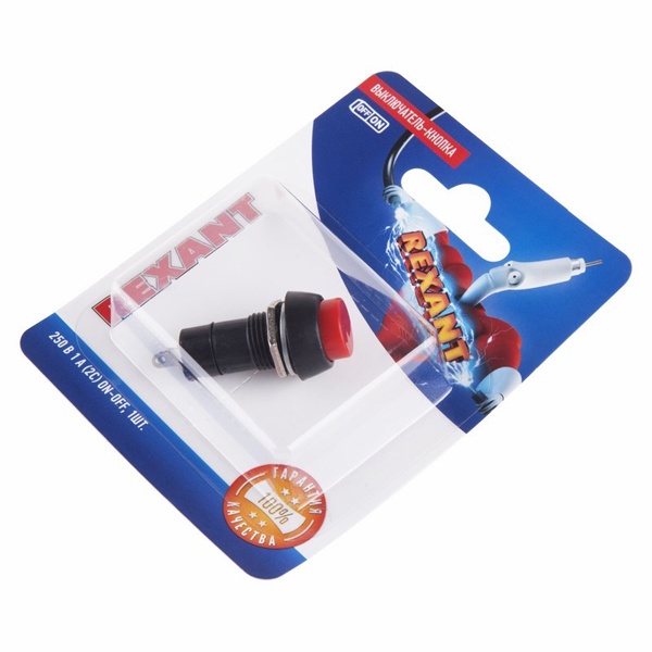 Выключатель-кнопка – это простейший коммутационный прибор, который предназначен для управления электрическими цепями переменного тока с напряжением до 250 Вольт. Данная модель на 2 положения (On/Off) работает по принципу замыкания цепи первым нажатием кнопки и размыкание цепи вторым нажатием. Такой выключатель торговой марки Rexant применяется в качестве комплектующего изделия различного электрооборудования: в аудиосистемах, блоках питания, устройствах освещения и других бытовых приборах. Внешне изделие состоит из двух основных частей: лицевой и контактной, и имеет пружинный возвратный механизм. Оно обладает круглой формой исполнения и оснащено красной кнопкой. Диаметр для установки составляет 12 мм. Монтаж устройства осуществляется на плоских панелях толщиной от 0.5 до 3 мм, с помощью гайки. Подключение проводников производится путем пайки. Количество контактов – 2, количество контактных групп – 1. Номинальная нагрузка тока для этой модели составляет 1 Ампер. Рабочий ресурс достигает 10 000 циклов. Изделие имеет фирменную упаковку и поставляется в блистере.