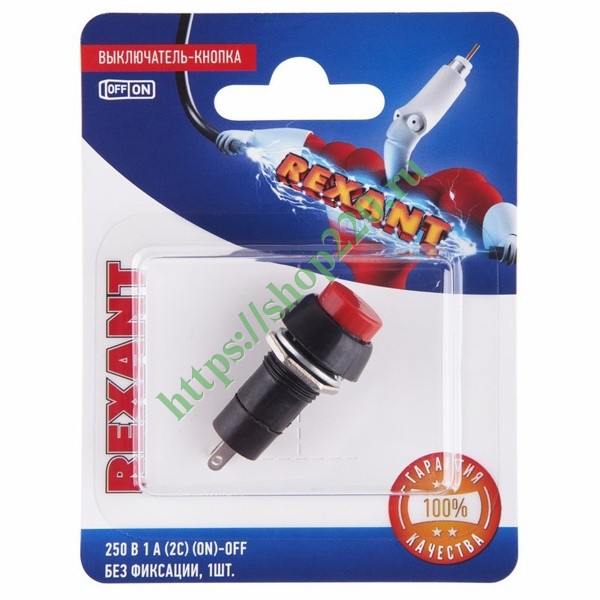 Круглый кнопочный выключатель от компании Rexant представляет собой компактный элемент управления, который предназначен для коммутации электрических цепей переменного тока напряжением до 250 Вольт путем включения-выключения питающего провода. Данная модель используется в качестве комплектующего изделия различного электрооборудования и имеет 2 положения без фиксации: (On)/Off. Принцип ее действия состоит в ручном управлении, пока удерживается кнопка. Это необходимо в тех случаях, когда нужна максимальная защищенность от случайного включения прибора, например, в пультах управления. Материалом изготовления корпуса выступает черный пластик, сама кнопка выполнена в красном цвете. Ее рабочий ресурс достигает 10 000 циклов. Номинальная токовая нагрузка для модели составляет 1 Ампер. Монтаж осуществляется с помощью гайки на плоских панелях толщиной от 0.5 до 3 мм. Установочный диаметр составляет 12 мм. Количество контактных групп – 1, количество контактов в контактной группе – 2. Подключение проводников производится путем пайки. Изделие поставляется в фирменной блистерной упаковке.
