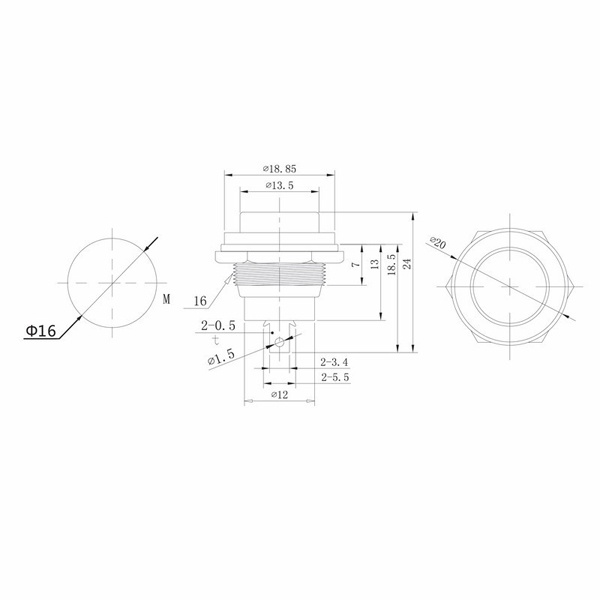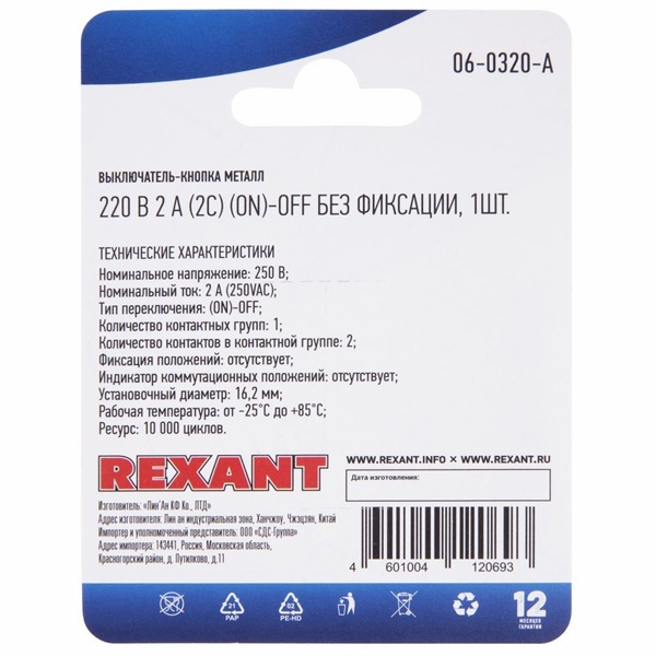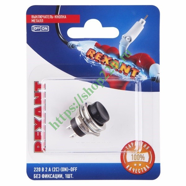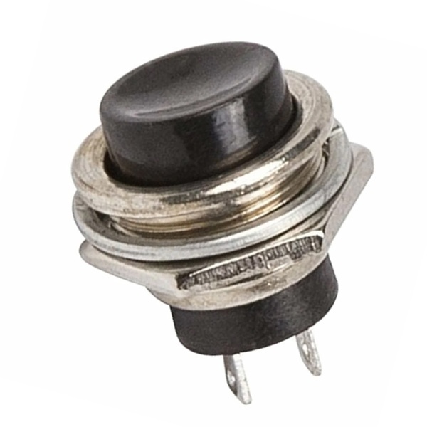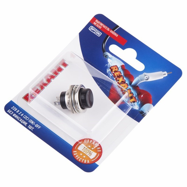 Кнопочный выключатель торгового знака Rexant представляет собой компактный круглый элемент управления, который широко используется в быту и на производстве и предназначен для коммутации электрических цепей переменного тока напряжением до 220 Вольт. Принцип его действия состоит в замыкании контактов питающего провода при нажатии на кнопку. Данная модель используется в качестве комплектующего изделия для различных приборов и имеет 2 положения без фиксации: (On)/Off. Это означает, что устройство имеет ручное управление и работает только при непрерывном удержании кнопки. Такой тип выключателей используется и для подачи команды импульсом напряжения. Внешне изделие оснащено черной пластиковой кнопкой и заключено в металлический корпус, чем гарантирует прочность и надежность при эксплуатации. Его механическая износостойкость составляет 10 000 циклов. Номинальный ток для модели не превышает 2 Ампера. Установочный диаметр достигает 16.2 мм. Монтаж производится гайкой на плоских панелях толщиной от 0.5 до 3 мм. Количество контактных групп – 1, количество контактов в контактной группе – 2. Подключение проводников производится путем пайки. Рабочая температура эксплуатации находится в диапазоне от -25 до +85 градусов Цельсия. Изделие поставляется в фирменной блистерной упаковке.