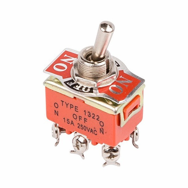 Компактный двухполюсный тумблер торговой марки Rexant предназначен для коммутации электрических цепей переменного тока напряжением до 250 Вольт и применяется в качестве комплектующего изделия на лицевых панелях различного электрооборудования. Он представляет собой миниатюрное устройство на 3 положения с фиксацией: On-Off-On. Устройство рассчитано на ток до 15 Ампер. Количество контактных групп – 2, количество контактов в каждой группе – 3, диаметр отверстия монтажа – 12,2 мм. Присоединение контактов выполняется с помощью винтов. Эта модель изготовлена из металла серебристого цвета в пластиковом корпусе оранжевого цвета. Световой индикатор коммутационных положений отсутствует, но в комплекте поставляется графический маркер с обозначением положений рычага тумблера. Его отличительной особенностью является перекидной переключатель, принцип действия которого основан на его перемещении в одну из позиций. Механическая износостойкость переключателя составляет 10 000 циклов. Рабочая температура эксплуатации находится от -25 до + 85 градусов Цельсия. Изделие упаковано в герметичный блистер.