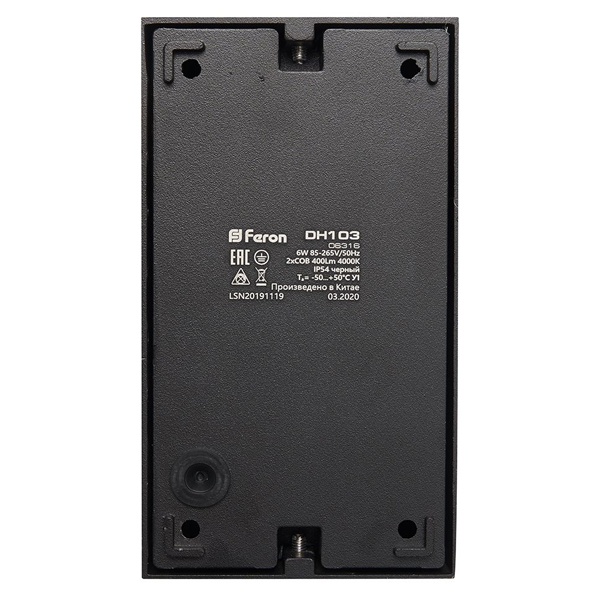 Светильник уличный светодиодный, на стену (ДБУ) FERON DH103, серия Дели, 2*3W, 4000К (белый натуральный), 230V/50Гц, 400Lm, IP54, 2LED*COB, класс защиты 1, раб.t -40C...+40C, цвет черный, корпус алюминий, 63*80*142мм,