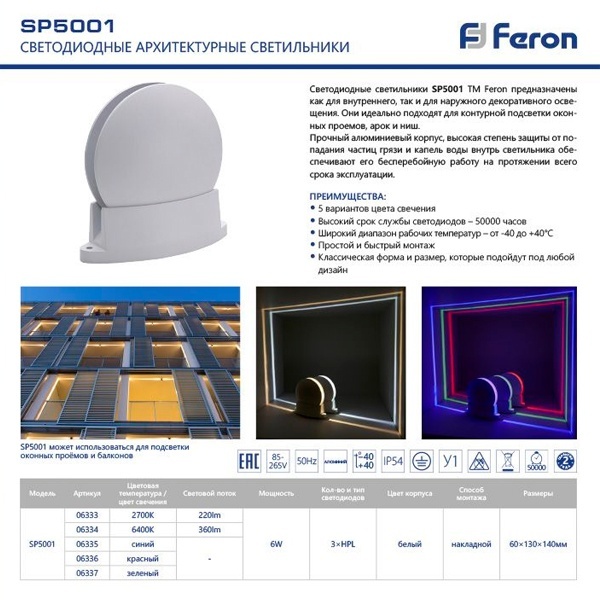 Светодиодные светильники SP5001 Feron предназначены как для внутреннего, так и для наружного декоративного освещения. Они идеально подходят для контурной подсветки оконных проемов, арок и ниш.