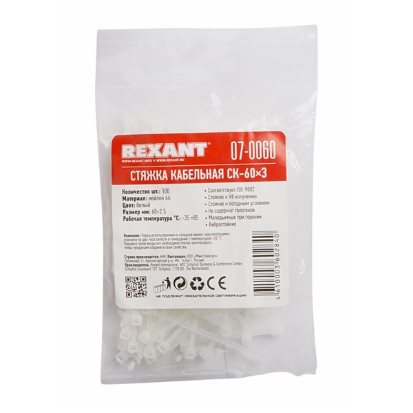 07-0060 Хомут-стяжка кабельная Rexant нейлоновая 60x2,5 мм белая [упаковка 100шт]