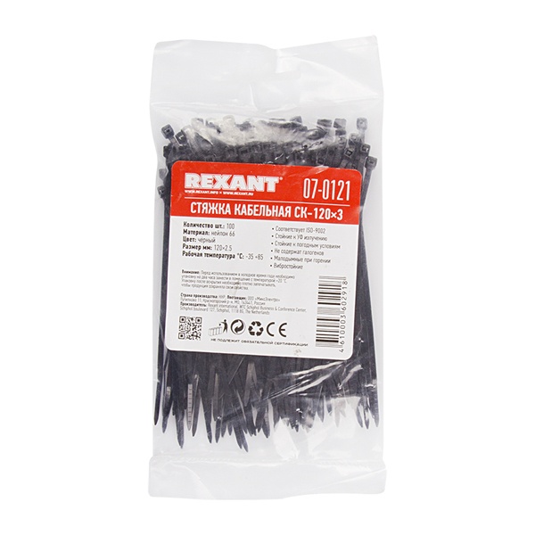 Хомут нейлоновый (кабельная стяжка) 120х2,5 мм белый REXANT предназначен для крепления или обвязки в жгут кабелей и проводов, крепления гибких гофротруб, а также других предметов к несущей поверхности или для соединения между собой. Такая стяжка используется при проведении электромонтажных работ, при монтаже структурированных кабельных систем, для бытовых нужд, а также в других отраслях народного хозяйства.