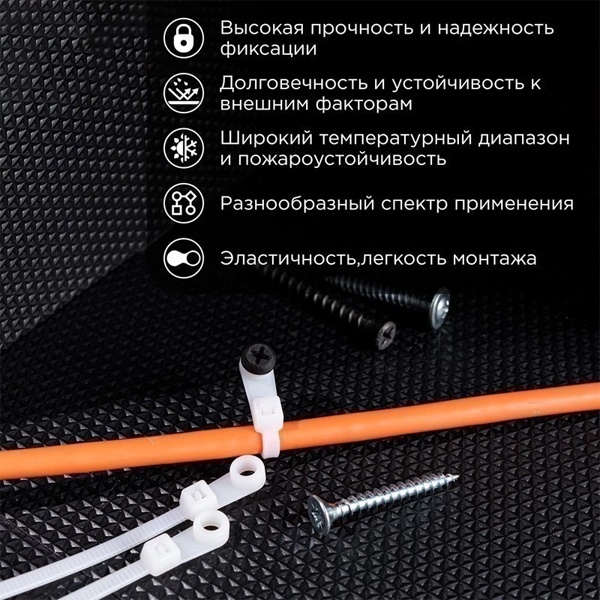Изделие оснащено специальным отверстием, спроектированным для удобного прикрепления винта или шурупа. Благодаря этой детали, пучок проводов или кабелей, закрепленный с помощью данного хомута, легко и надежно крепится к разнообразным поверхностям, будь то пластик, дерево или другие материалы.