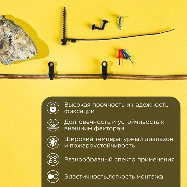 Материал изготовления – нейлон – обеспечивает хомуту высокую устойчивость к воздействию органических растворителей и горюче-смазочных материалов. Помимо этого, он является экологически чистым, что делает данный продукт безопасным и дружественным к окружающей среде.