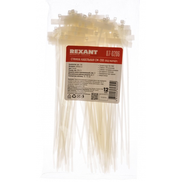 Хомут нейлоновый под маркер (кабельная стяжка) 200 мм белый REXANT предназначен для крепления или обвязки в жгут кабелей и проводов, крепления гибких гофротруб, а также других предметов к несущей поверхности или для соединения между собой. Такая стяжка используется при проведении электромонтажных работ, при монтаже структурированных кабельных систем, для бытовых нужд, а также в других отраслях народного хозяйства.