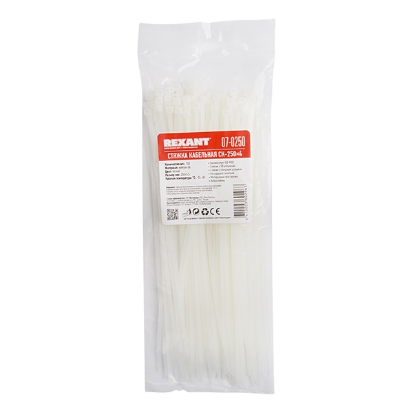 07-0250 Хомут-стяжка кабельная Rexant нейлоновая 250x3,6 мм белая [упаковка 100шт]