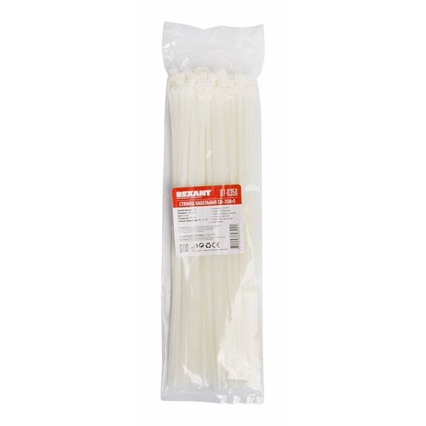 Пластиковый стяжной хомут длиной 350 мм и шириной 4,8 мм, цвет белый, упаковка 100 штук, Рексант 07-0350