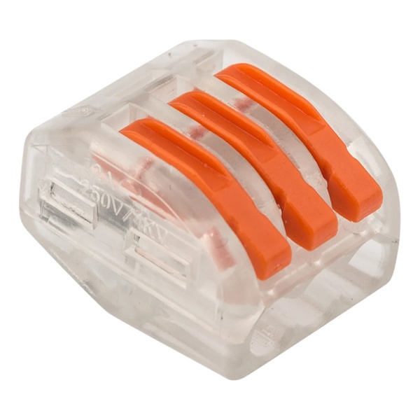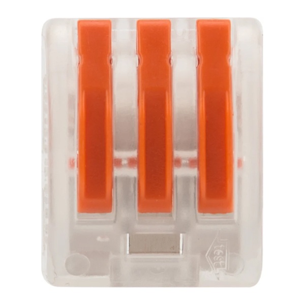 Соединительная многоразовая клемма REXANT на 3 проводника с плоско-пружинным зажимом в прозрачном корпусе предназначена для подсоединения медных одножильных и многожильных проводников тонкого сечения. Перед монтажом с соединяемых проводников необходимо снять изоляцию в соответствии с обозначениями на корпусе клеммы (9-12 мм). Зачищенный участок с монтажной стороны не должен иметь сильных изгибов. Вставьте его в свободное гнездо клеммы, предварительно подняв оранжевый рычажок, после этого опустите рычажок в исходное положение. Контакт осуществляется путем зажима проводника пластиной. Конструкция предотвращает случайное размыкание контакта. Специальное технологическое отверстие на корпусе клеммы предназначено для проверки соединения тестером-пробником или щупом мультиметра. Оболочка из прозрачного пластика делает контакт изолированным, а также позволяет визуально оценить положение проводника. Извлечение проводника (демонтаж) осуществляется действиями в обратном порядке.