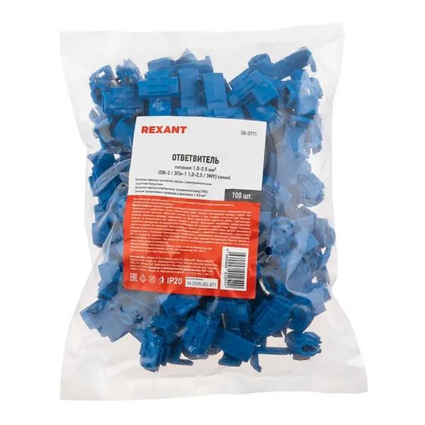Ответвитель 1.0-2.5 мм? синий REXANT предназначен для ответвления электроэнергии от токонесущего провода с последующей подачей питания на дополнительное электрооборудование. Такой, применяемый в электрике и радиоэлектронике, ответвитель представляет собой пластиковый корпус, внутри которого расположен контактный нож.