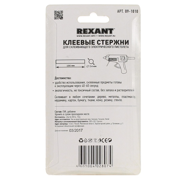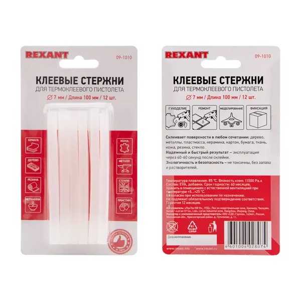- Экологичность - термоклей состоит из смолы ЭВА, которая нетоксична, не выделяет запаха и не содержит растворителей. Это позволит пользоваться термоклеем REXANT даже аллергичным людям.