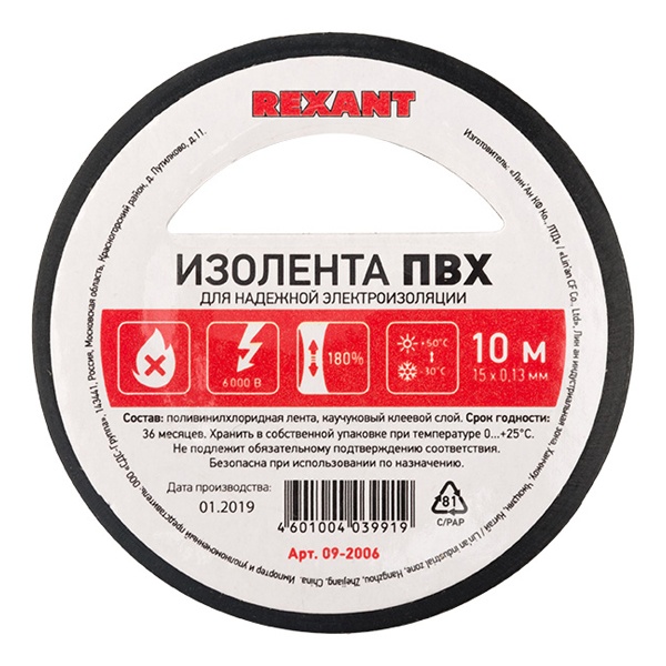 Изолента черная REXANT представляет собой поливинилхлоридную пленку, разрезанную на полосы шириной 15 мм и длиной 10 м. На одну ее сторону нанесено клеевое покрытие, которое и играет ключевую роль в предназначении этого расходного материала. Значительной особенностью изоляционной ленты является ее термостойкость – она не поддерживает горение. Диапазон температур использования изолент довольно широк - от 0°С до +70°С.