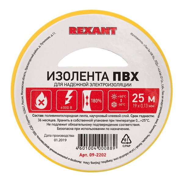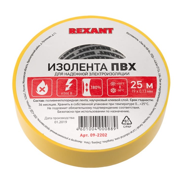 Изолента желтая REXANT представляет собой поливинилхлоридную пленку, разрезанную на полосы шириной 19 мм и длиной 25 м. На одну ее сторону нанесено клеевое покрытие, которое и играет ключевую роль в предназначении этого расходного материала. Значительной особенностью изоляционной ленты является ее термостойкость – она не поддерживает горение. Диапазон температур использования изолент довольно широк - от 0°С до +70°С.