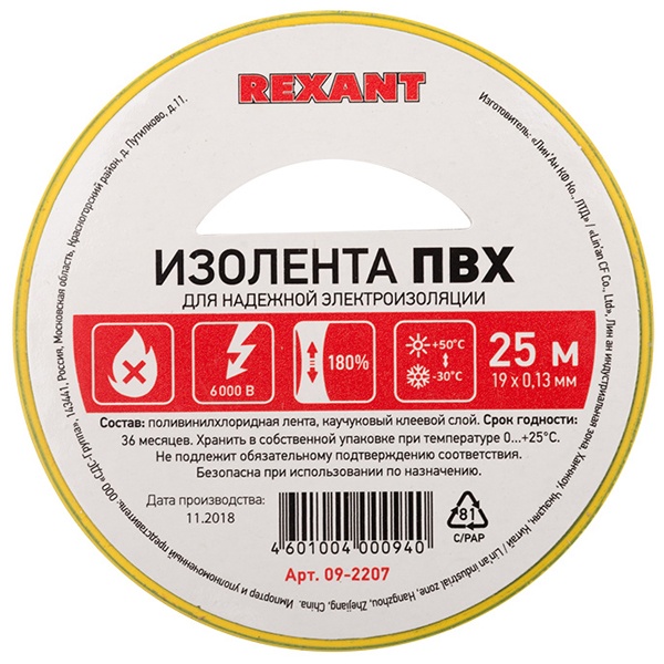Изолента желто-зеленая REXANT представляет собой поливинилхлоридную пленку, разрезанную на полосы шириной 19 мм и длиной 25 м. На одну ее сторону нанесено клеевое покрытие, которое и играет ключевую роль в предназначении этого расходного материала. Значительной особенностью изоляционной ленты является ее термостойкость – она не поддерживает горение. Диапазон температур использования изолент довольно широк - от 0°С до +70°С.