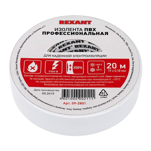 Профессиональная изолентa белая REXANT® класса PREMIUM - новинка в семействе расходных материалов торговой марки REXANT®. Используется для обмотки проводов и кабелей с целью их изоляции. Температурный диапазон работы от -10°С до +70°С. Изолента REXANT® устойчива к растяжению и разрывам, не поддерживает горение. Также находит широкое применение в бытовых целях. Цвет-белый, толщина пленки - 0,18 мм, ширина ленты - 19 мм, длина рулона - 20 м.