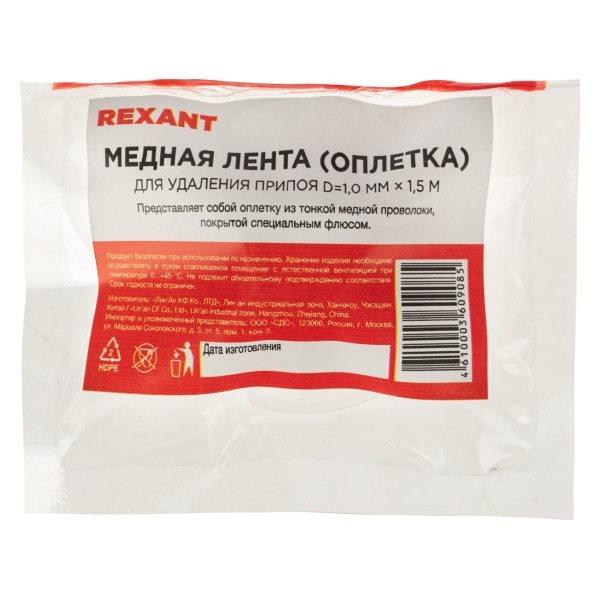Оплетка для удаления припоя Рексант, шириной 1,0 мм, длиной 1,5 м 09-3001