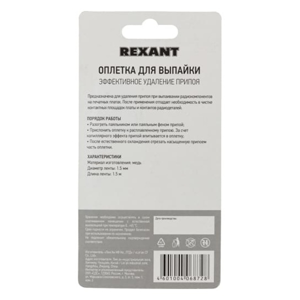 Оплетка для удаления припоя Рексант, шириной 1,5 мм, длиной 1,5 м, в диспенсере 09-3032