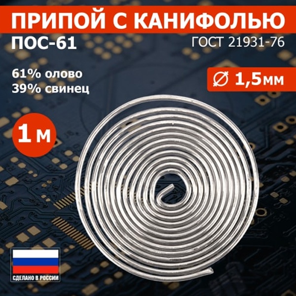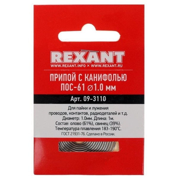 Припой с канифолью ПОС-61 ? 1 мм спираль 1 метр REXANT предназначен для создания механически прочного и герметичного соединения деталей между собой или для их фиксирования на плате (пайка и лужение радиоэлектронных приборов, медицинской аппаратуры, автодеталей, печатных плат, электроаппаратуры и т. д.).