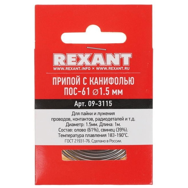 Припой с канифолью ПОС-61 ? 1,5 мм спираль 1 метр REXANT предназначен для создания механически прочного и герметичного соединения деталей между собой или для их фиксирования на плате (пайка и лужение радиоэлектронных приборов, медицинской аппаратуры, автодеталей, печатных плат, электроаппаратуры и т. д.).