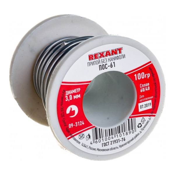 Припой в катушке ПОС-61 ? 3 мм (без канифоли) REXANT предназначен для создания механически прочного и герметичного соединения деталей между собой или для их фиксирования на плате (пайка и лужение радиоэлектронных приборов, медицинской аппаратуры, автодеталей, печатных плат, электроаппаратуры и т.д.).