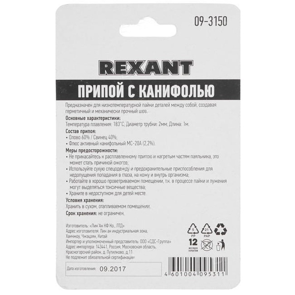 Припой с канифолью REXANT представляет собой проволоку (диаметром 2 мм) из сплава олова (60 %) и свинца (40 %). Используется в пайке для соединения деталей между собой и позволяет создать герметичный, механически прочный (устойчивый) шов. Нагреваясь до температуры плавления (183...188 °С) припой: расплавляется, смачивает спаиваемый металл и, растекаясь по нему — заполняет место между соединяемыми деталями.В свою очередь флюс канифольный активный (MC-20A) помогает сделать паянное соединение более прочным! Убирая окислительную плёнку со спаиваемых поверхностей и защищая их от дальнейшего окисления при пайке.